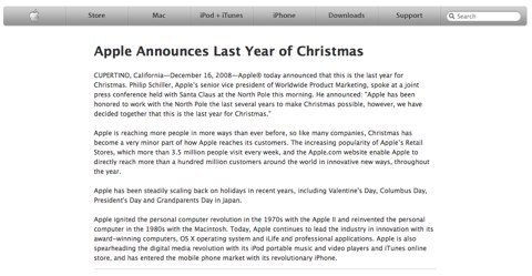 Ok, ok, si tratta solo di uno scherzo. E’ lo sfottò organizzato da alcuni utenti nel sito applecanceledchristmas, cioè Apple ha cancellato il Natale, che riprende la grafica del sito di Apple. Ci eravate cascati vero?