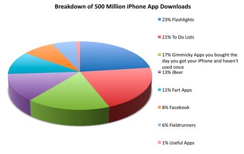 Tra il mezzo miliardo di download non mancano le chicche: il 17% sono applicazioni scaricate il primo giorno di acquisto del telefono ma non ancora usate, 8% sono i download di Facebook, 6% quelli di Fieldrunners e, purtroppo 11% di applicazioni che simulano le puzze.