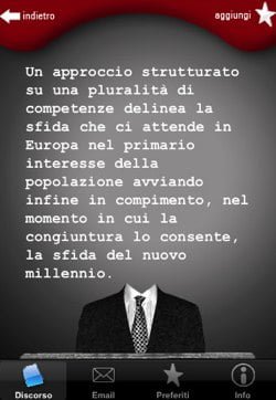 Sono tutti argomenti spinosi che potrebbero farvi perdere voti. Per rispondere senza rispondere da oggi c’è l’applicazione Politichese per iPhone e iPod Touch. Alla prima domanda difficile basta premere su “crea discorso” e leggere ciò che appare sullo schermo. Se il risultato vi apporta applausi potete salvarlo in preferiti o inviarlo via email. Il programma pesa 400 KB e può essere scaricato dall’App Store per 1,59 €.
