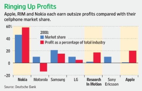 Se lo è chiesto Brian Modoff analista di Deutsche Bank effettuando una bella scoperta: Apple e RIM possiedono il 3% del mercato ma incassano il 35% di tutto il fatturato mondiale. Dominano il 32% di tutto il mercato degli smartphone che nel complesso costituisce il 13% del mercato mondiale. Nokia, la regina assoluta, possiede il 46% del mercato ma riesce a prendere solo il 55% del fatturato.