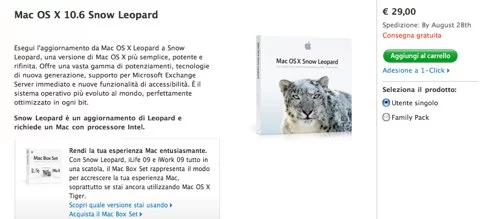 Dopo aver mandato gli Apple Store off line, Apple ha finalmente risolto ogni dubbio riguardanti i rumors degli ultimi giorni: Snow Leopard è prenotabile da questo momento e sarà consegnato dal 28 agosto. Il prezzo per la versione aggiornamento è di 29 €, per la versione completa (utile per chi ha Tiger) è di 129 €, la versione Family Pack con 5 licenze è di 49 €. Il Mac Box Set, invece, che include anche iLife ’09 e iWork ’09 è di 169 €.