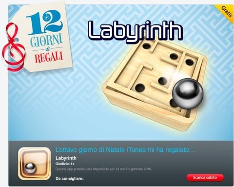 Interrompendo il flusso musicale dei giorni scorsi, oggi Apple regala il gioco Labyrinth per iPhone e iPod Touch. Si tratta dell’8° regalo della promozione “12 giorni di regali“. Il gioco pesa 5,3 MB e consiste nel portare una biglia di ferro nella buca alla fine di un percorso usando l’accelerometro.
