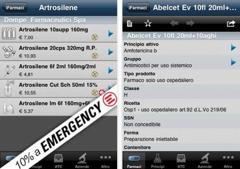 Se siete dei medici, dei farmacisti o semplicemente studenti di medicina, vi sarà utile un prontuario di farmaci nel vostro iPhone o iPod Touch. Tra le applicazioni più conosciute in questo settore c’è iFarmaci prodotto in Italia. Il software contiene 8.800 farmaci e 30.000 formulazioni certificate da Infofarm.net e aggiornate a dicembre 2009.