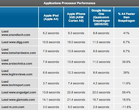 Alcuni test effettuati da AnandTech con WebKit SunSpider JavaScript Benchmark confermano tutto. Mettendo in relazione un iPad con un iPhone 3GS e un Nexus One, si nota l’estrema velocità del dispositivo. Il risultato migliore si è avuto nel caricamento del sito di Engadget in 13,8 secondi contro i 22,8 dell’iPhone e i 22 del Nexus One. Per leggere tutta la tavola delle rilevazioni, basta andare dopo il continua.