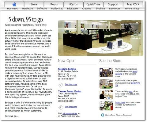 La società iniziò la vendita al dettaglio in prima persona con due negozi. Lo slogan dei negozi era “5 down. 95 to go” in riferimento al fatto che Apple possedeva il 5% del mercato dei computer e voleva il 95%, vale a dire il mercato di Windows. Gli Apple Store, infatti, furono disegnati per affascinare gli utenti Windows. Un luogo magico dove i curiosi potevano soddisfare le loro curiosità mediante le conoscenze approfondite del personale e la presenza di computer Mac pronti da usare e, eventualmente, acquistare.