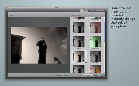 Sviluppato dalla premiata Iconfactory, Flare è un’applicazione per chi vuole modificare o aggiustare le foto. L’applicazione ha un’interfaccia grafica semplice da usare e contiene oltre 90 effetti ed impostazioni per produrre foto di grande effetto.