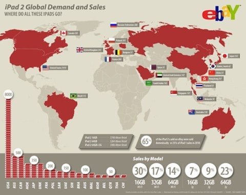E’ accaduto anche con l’iPad 2. Dal giorno della vendita, infatti, il sito di aste ha registrato 12.000 unità piazzate in diverse parti del Mondo. Il 65% di queste sono rimaste negli USA, mentre tra gli altri Paesi serviti c’è la Russia, il Canada, Hong Kong, il Giappone e il Regno Unito.