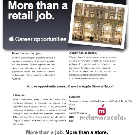 Ieri abbiamo visto l’ufficializzazione dell’Apple Store di Napoli che, molto probabilmente, sarà aperto nel centro commerciale Campania di Marcianise, posto a metà tra Napoli e Caserta. Chi ha mandato il proprio curriculum nell’apposita sezione del sito di Apple, ha ricevuto un invito via email dove viene indicato il posto esatto in cui Apple terrà una presentazione dei ruoli e inviterà i presenti ad effettuare i colloqui di assunzione.