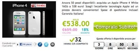 Dopo l’offerta di questa mattina dell’iPad 2, arriva una dedicata anche all’iPhone 4. Questa volta è su PrezzoFelice che permette di comprare le ultime 50 unità a disposizione nei prossimi 3 giorni.