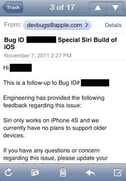 L’utente aveva segnalato l’assenza di Siri dal suo iPod Touch come un bug. Dopo aver installato iOS 5, ha comunicato ad Apple, Siri non è apparso nel suo player. Apple di tutta risposta, mediante una email dei tecnici, ha scritto che Siri funziona solo sull’iPhone 4S e non è previsto nessun supporto ai dispositivi precedenti.