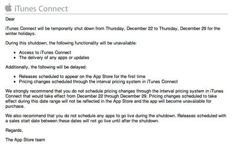 Per questo Natale il sistema sarà inaccessibile dal 22 al 29 dicembre per le relative vacanze di Natale dello staff. La società avverte che oltre a non poter cambiare i prezzi in quel periodo, la società non pubblicherà nessuna nuova applicazione o aggiornamento, quindi gli sviluppatori sono pregati di organizzarsi di conseguenza.