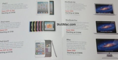 Un depliant scoperto negli USA anticiperebbe alcuni di queste offerte valide solo durante quella giornata. L’iMac sarà scontato di 101 $, così come i MacBook. Gli iPod Touch avranno uno sconto che varia tra i 21 e i 41 $, mentre il Nano sarà scontato di 11 $ e l’iPad da 41 a 61 $.