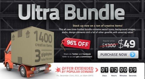 L’Ultra Bundle è il bundle di materiale per tutti coloro lavorano con la grafica. Nel pacchetto sono presenti 1.400 elementi di grafica dal peso di 3 GB e venduti per 49 $, circa 38 €, anzichè 1.300 $. Nel pacchetto sono inclusi: