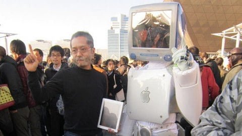Nella città di Chongqing due persone hanno voluto rendere omaggio ad Apple in questo modo. Uno vestito da pseudo Steve Jobs armato di iPad e l’altro da uomo Mac con componenti formati da vecchi computer della società.