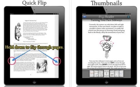 Magic Reader, infatti, permette di sfogliare le pagine con la testa. In pratica la fotocamera frontale del tablet rileva i movimenti della testa. Quando l’utente muove la testa verso destra o sinistra in modo netto la pagina si gira da sola. L’utilità si scopre quando si cucina e si hanno le mani sporche, oppure mentre si leggono gli spartiti musicali quando si suona uno strumento.