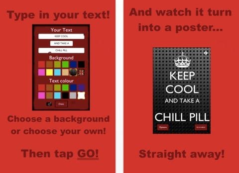 Keep Calm and Carry On permette di scrivere ciò che si vuole sul volantino, scegliere i colori e generare, così, il banner da diffondere nei social network. Keep Calm and Carry On pesa 900 KB e si scarica gratis dall’App Store.