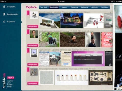 Il tutto è gestibile anche mediante un’apposita applicazione disegnata per iPad. TumbleOn HD permette di gestire il proprio Tumblr fotografico attraverso una buona interfaccia grafica per inserire foto oppure scoprire altri blog fotografici.