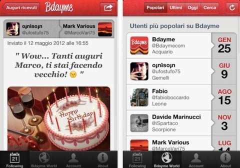 L’applicazione BDayMe ha una buona grafica e permette di avere l’elenco dei compleanni dei propri amici. I contatti di Twitter nell’elenco si possono auto inserire scaricando a loro volta l’applicazione. Quando verrà il vostro compleanno, inoltre, è possibile inserire un messaggio di pubblicazione automatica di un tweet per avvisare i propri follower del proprio compleanno. Una sezione di auguri inviati e ricevuti permette di tracciare le persone che hanno reso omaggio al compleanno e alle quali avete ricambiato la cortesia.