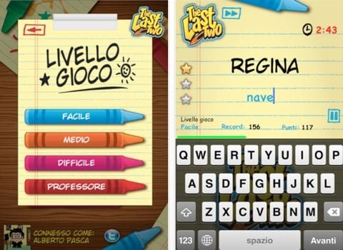 Questa regola così semplice è alla base di The Last Two, un gioco per iPhone e iPad. All’interno del videogame ci sono 250.000 parole in italiano. Ogni sessione dà diritto a un certo tempo, regolato in base al livello di difficoltà, in cui bisognerà formulare il maggior numero di parole. Ogni sessione dà diritto a tre consigli e, in caso di difficoltà, si può cambiare parola scuotendo il dispositivo.