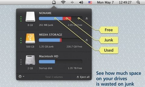Di solito questo tipo di documenti non dà fastidio, ma non è bello sapere che in una periferica esterna ci sia della spazzatura. Per eliminarla ci sono alcune app per Mac, tra cui CleanMyDrive. Attraverso una grafica pulita, l’app indica se in un disco esterno ci sono questi file e li elimina con un tasto. Inoltre è possibile osservare quando spazio disponibile resta nel disco e a quanto ammonta quello utilizzato.