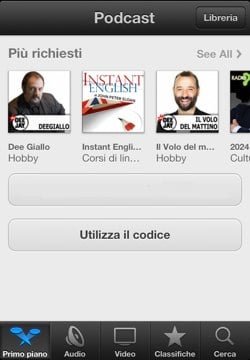 Si tratta di una sezione dove inserire i codici redeem, in questo caso riferiti ai podcast, oppure ai codici delle iTunes Card. Ma perchè inserire un codice per contenuti scaricabili gratuitamente? Siccome un indizio elimina l’altro, dalla nostra sottrazione resta l’ipotesi dei podcast a pagamento.