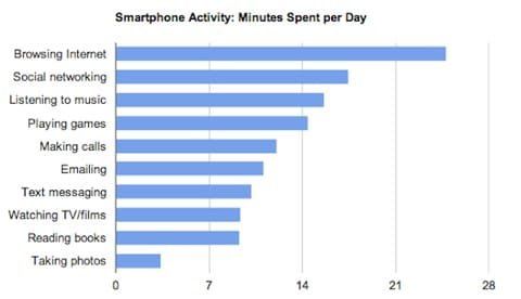 Lo rivela un’indagine svolta da O2 presso i suoi clienti in Gran Bretagna. In media gli utenti passano 25 minuti su internet ogni giorno, 17 minuti per visualizzare i loro account nei social network, 13 minuti per giocare, 16 minuti ascoltando musica e, solo in quinta posizione, parlano al telefono per 12 minuti.