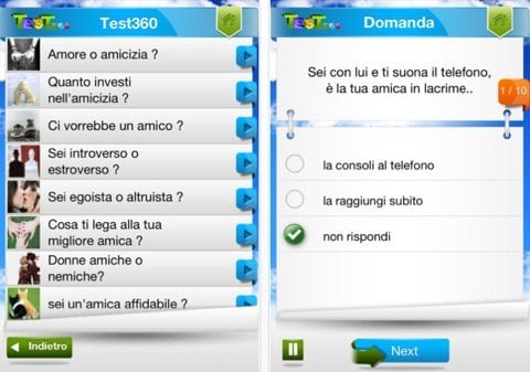 Test360 integra tanti test divisi in 6 categorie: amicizia, amore, tempo libero, divertenti, personalità e mondo del lavoro. Anzichè usare carte e penna, le risposte si danno direttamente nell’applicazione per arrivare al responso finale. Da alcune prove che ho effettuato mi sono accorto che la maggior parte sono volti al mondo femminile, probabilmente per il tipo di target per cui sono stati creati.