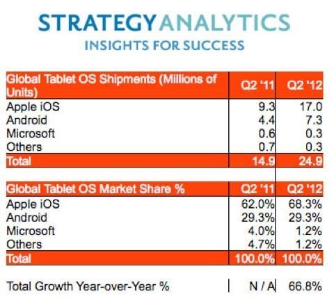 Di questi 17 milioni sono iPad, quindi Apple ha il 68,3% del mercato rispetto al 62% dello stesso trimestre del 2011. Al secondo posto troviamo Android con 7,3 milioni di tablet e il 29,3% del settore, in pratica con una crescita pari a zero. Segue Microsoft con l’1,2% del mercato, anche se nel 2011 la suo quota era del 4%. Tutti gli altri concorrenti hanno una quota molto bassa.