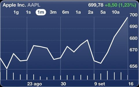 Per questo motivo gli investitori sono euforici portando il titolo Apple ha sfiorare i 700 $ ad azione, precisamente 699,78 dollari con un +1,23%. Il tutto si traduce in una capitalizzazione di 656 miliardi di dollari. Una vera e propria fortuna.