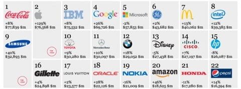 Al primo posto di questa classifica troviamo Coca-Cola con un valore di 77,8 miliardi di dollari e una crescita dell’8%. Al secondo posto troviamo Apple con una crescita del 129% e un valore di 76,6 miliardi di dollari, seguita da IBM con un valore di 75,5 miliardi.
