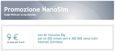 L’operatore non può neanche usare il nome iPhone o il marchio Apple nel suo sito. Quindi come fare per associare un’offerta agli utenti iPhone? Semplice, nominando la nano SIM, attualmente supportata solo dall’iPhone 5. Chi attiverà una nano SIM, quindi, potrà attivare l’opzione All Inclusive Big per 5 anni.