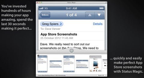L’app consente di creare screenshot per app destinate all’iPad, iPhone e iPhone 5. Status Magic pesa 1,8 MB e si scarica per 4,49 € dal Mac App Store.