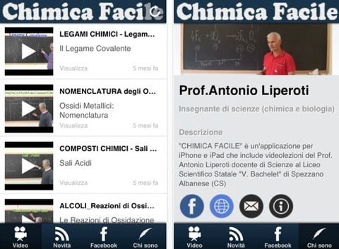 Nell’app Chimica Facile sono unite queste 200 lezioni divise per argomenti. Grazie a un collegamento a Facebook è possibile scrivere domande o commenti direttamente nell’account del professore e attendere la risposta.