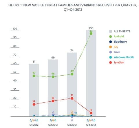 In base all’analisi effettuate da F-Secure per il quarto trimestre del 2012, infatti, si evince che sistema operativo di Google è il meno sicuro perché è il più bersagliato dal malware. La crescita dei software pericolosi ha avuto un incremento enorme nello scorso anno. Attualmente ci sono almeno 96 malware che hanno causato un danno di 47 milioni di dollari in denaro sottratto con SMS premium.