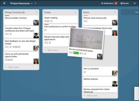 Trello immagina ogni progetto come delle schede. Dopo aver creato l’elenco di contatti e di collaboratori, sarà possibile creare la scheda del progetto al quale si può attaccare, come fosse una lavagna con dei post-it, delle piccole schede contenenti il nome delle persone che si occupano delle varie funzioni, immagini, note, video e così via.