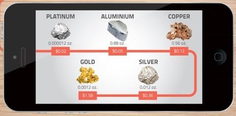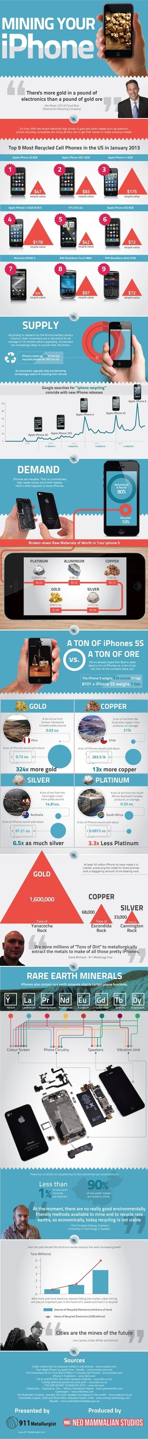 In media un iPhone 3G ha un valore di riciclo di $ 47, contro gli $ 83 di un iPhone 3GS e i $ 175 di un iPhone 4. All’interno di un iPhone 5 ci sono in media 0,00003 grammi di platino, 25 grammi di alluminio, 16 grammi di rame, 0,034 grammi di oro e 0,34 grammi di argento. Sono cifre che appaiono basse ma se sommiamo tutti i telefoni riciclati si arriva a dei veri e propri tesori.