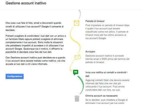 Forse sarà l’ultimo dei vostri pensieri, ma sapete che fine farà il vostro account di Google una volta che sarete morti? Se volete lasciare le vostre ultime volontà per la vostra vita digitale Google ora vi permette di farlo. L’utente può impostare un periodo che va da 1 mese ad 1 anno di inattività. Dopo questo periodo si attiva una procedura automatica.