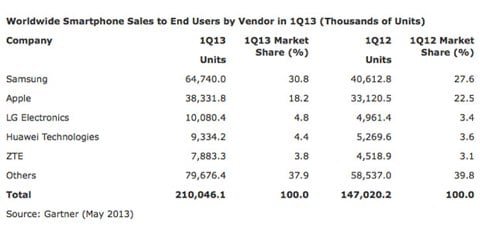 La guerra non sta andando bene per Apple che, a fronte di un unico dispositivo per la fascia alta del mercato, non può superare le quote di mercato di Android che è cresciuta così tanto da arrivare al 74,4% del mercato dei telefoni intelligenti. Lo rivela un’indagine condotta da Gartner confermando le vendite del primo trimestre fiscale del 2013.