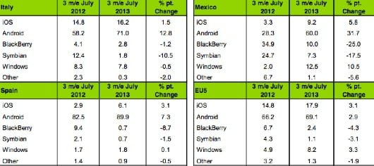 Nel resto del mondo iOS perde quota in Germania (–2,1%) e in Cina (–3,9%). Cresce molto in Gran Bretagna (+7,8%) e negli Stati Uniti (+7,8%). In quest’ultima nazione controlla il 43,4% del mercato contro il 51,1% di Android. La media dei primi 5 mercati in Europa[1] porta iOS al 17,9% del mercato in crescita del 3,1%, mentre Android cresce del 2,9% a 69,1% del settore e poi BlackBerry con appena il 2,4% del mercato in calo del 4,3%.
