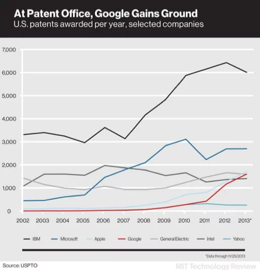 Nonostante questo Apple registra più brevetti: circa 1.900 contro i 1.800 di Google nel corso del 2013. Chi registra più brevetti nel settore, però, è IBM che solo quest’anno ne ha registrati oltre 6.000.