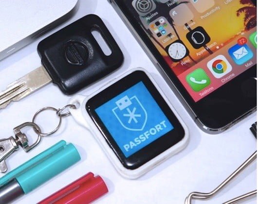 Passfort è una soluzione hardware. Questo piccolo dispositivo grande 4,78 x 3,81 x 1,37 centimetri, ha un peso di 20 grammi. Esteticamente sembra quasi un Apple Watch, ma in realtà lo schermo serve ad accedere alle password.