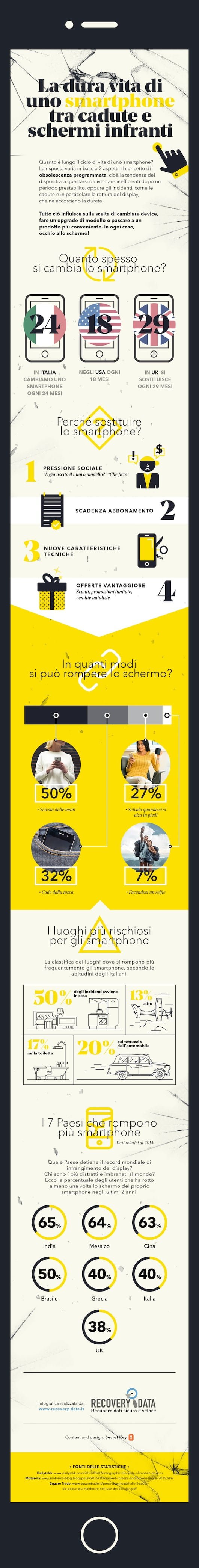 Secondo un’infografica (che potete ingrandire premendo sull’immagine in alto) realizzata da Recovery Data, il 50% degli smartphone si rompe perché scivola tra le mani. Il 32% cade dalla tasca, mentre il 27% cade mentre ci alziamo e il 7% mentre ci si scatta un selfie.