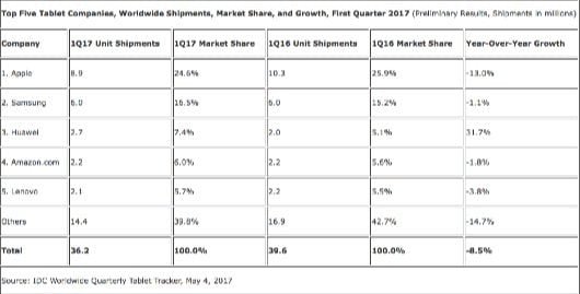 Ora che Apple ha fornito i suoi dati trimestrali, come stanno facendo altre aziende nel settore, IDC può stilare la fotografia per il primo trimestre del 2017, relativa al mercato dei tablet. La prima notizia è che il settore non va molto bene. Se nello stesso trimestre del 2016 erano stati venduti 39,6 milioni di tablet, in questo trimestre sono stati venduti 36,2 milioni, con un calo dell’8,5%.