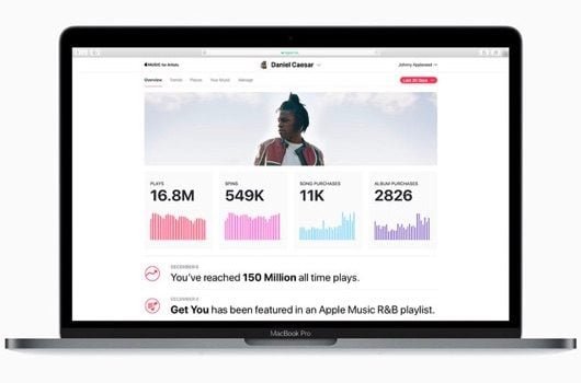 Con Apple Music for Artists è possibile vedere il numero di ascolti, i brani venduti in iTunes Music, le playlist dove è stato ascoltato il brano, le fasce di età e le aree geografiche dove hanno ricevuto maggiore apprezzamento.