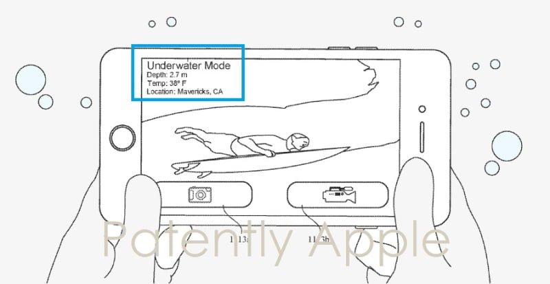 La società di Cupertino pensa a una Underwater Mode: una modalità da attivare quando bisogna registrare video o scattare foto in acqua. Quando questa si attiva, non sappiamo se in automatico rilevando l’acqua come avviene con gli Apple Watch, l’interfaccia utente cambia.