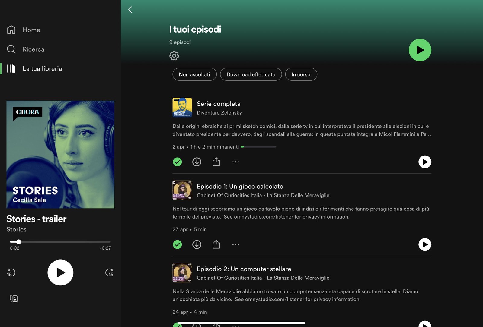 Su Spotify non si possono cancellare le puntate dei podcast. Si può solo premere sulla spunta di “Segna come ascoltato” per farle sparire dall’elenco delle nuove puntate, influenzando erroneamente così l’algoritmo dei suggerimenti.