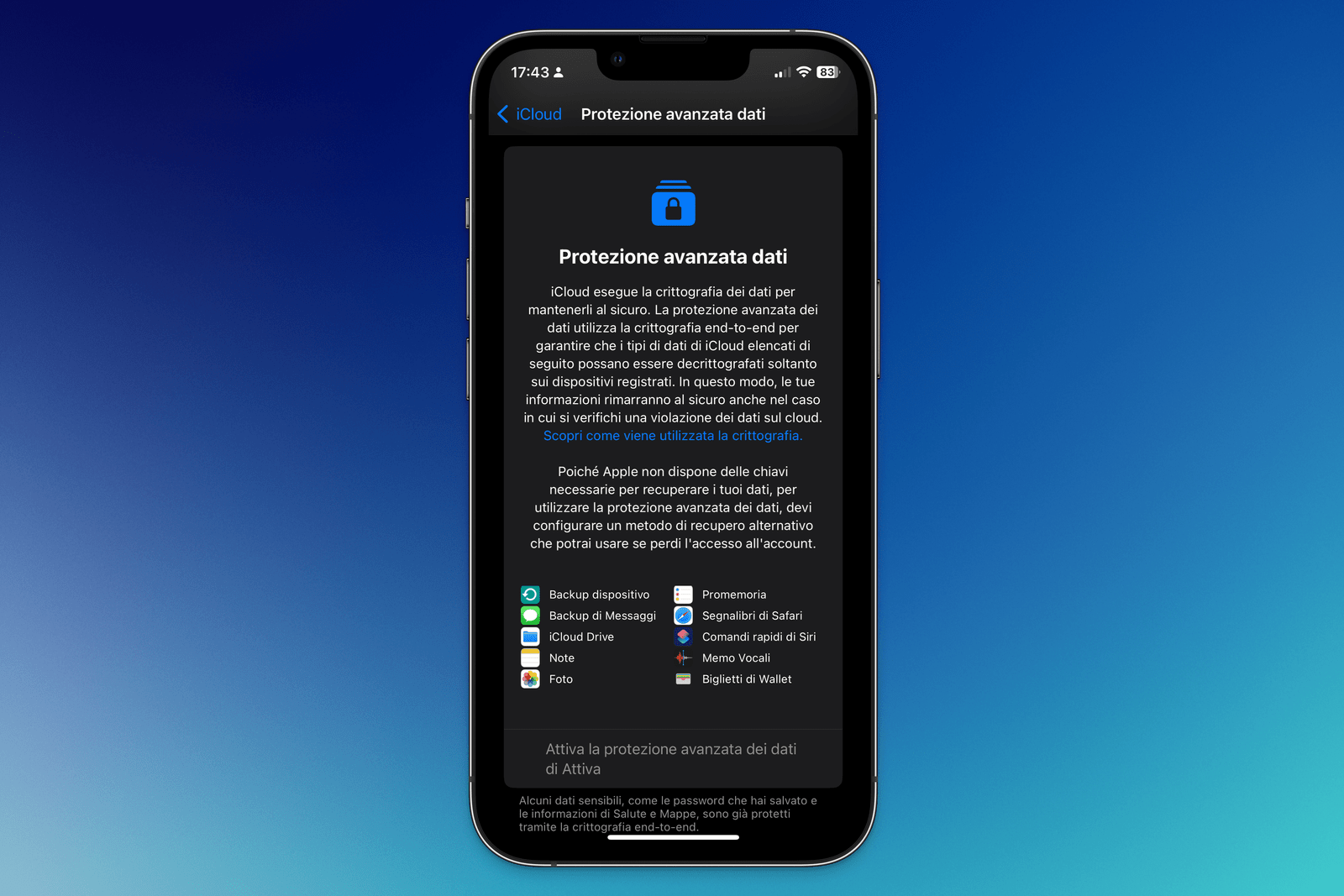 Attualmente Advanced Data Protection con i backup cifrati di iCloud è disponibile solo negli Stati Uniti e per chi possiede la beta di iOS 16.2. Sarà disponibile per tutti nel corso del 2023.