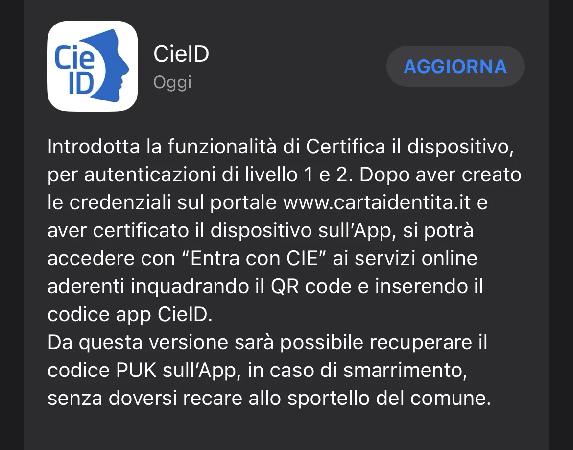 Quella del recupero del codice PUK non è l’ultima novità dell’app CieID. Ora si può autenticare il proprio dispositivo per il livello 1 e 2 di sicurezza, che credo siano il livello 1 e 2 della sicurezza di SPID.