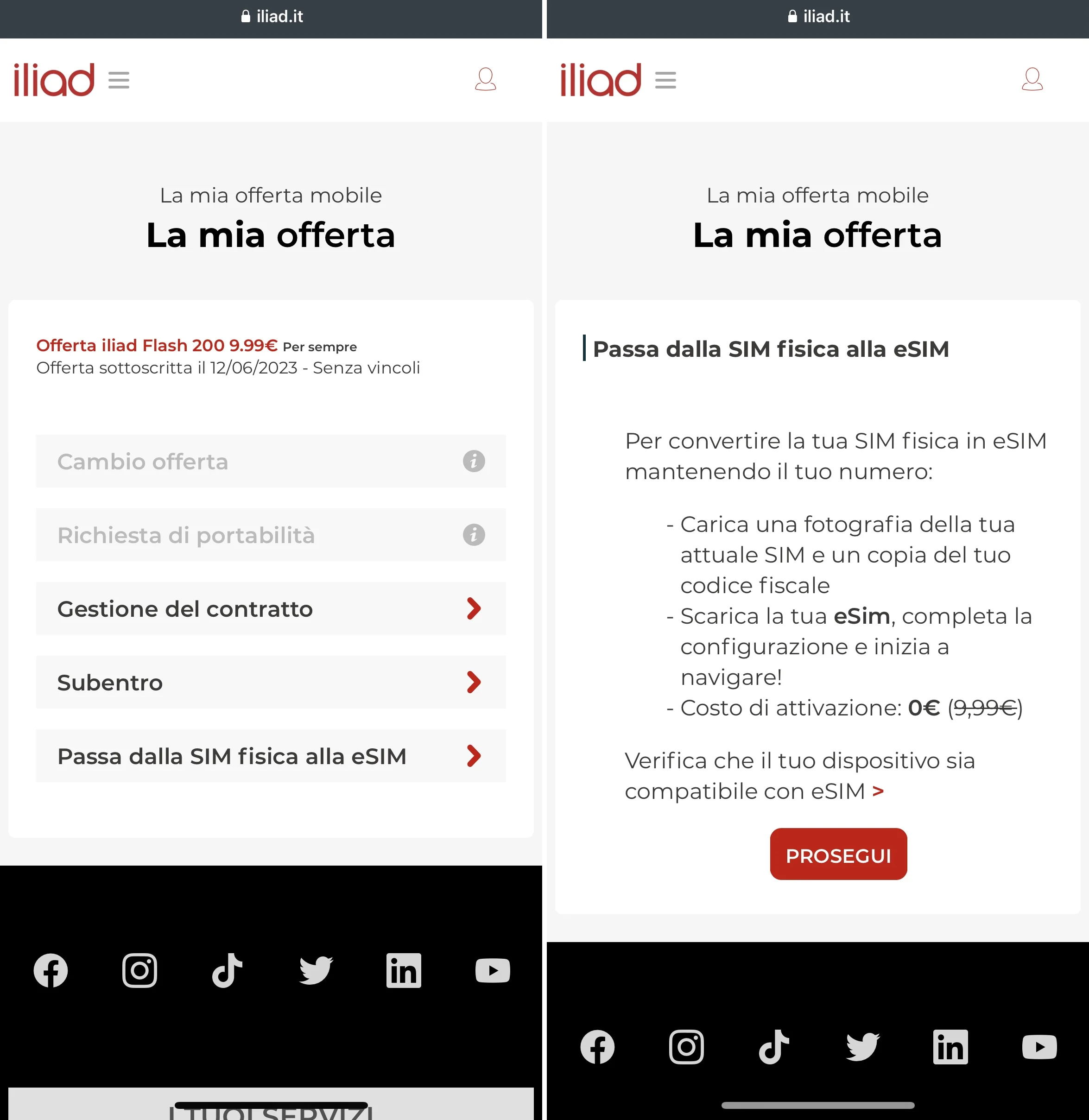Se siete già clienti basta andare nell’area personale nel sito Iliad. Sotto la voce “La mia offerta” c’è la voce “Passa dalla SIM fisica alla eSIM”. Qui verrà indicato l’eventuale costo di attivazione, gratis per la mia tariffa, e i requisiti.